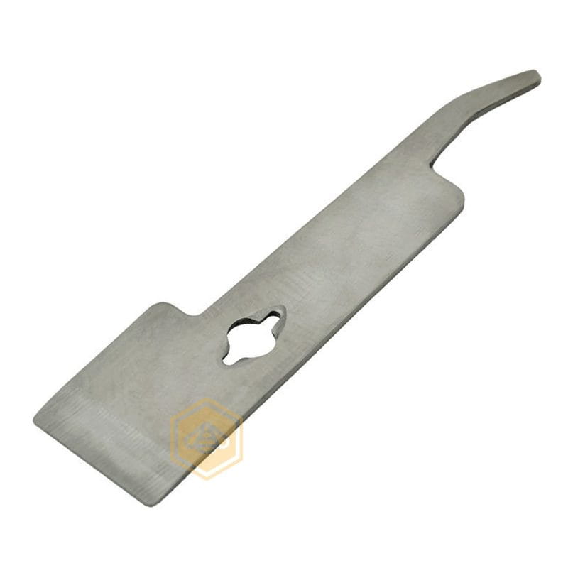 Klasyczne,krótkie dłuto pszczelarskie bez oprawy z haczykiem do podważenia ramki pszczelej oraz otworem w środkowej części dłuta.