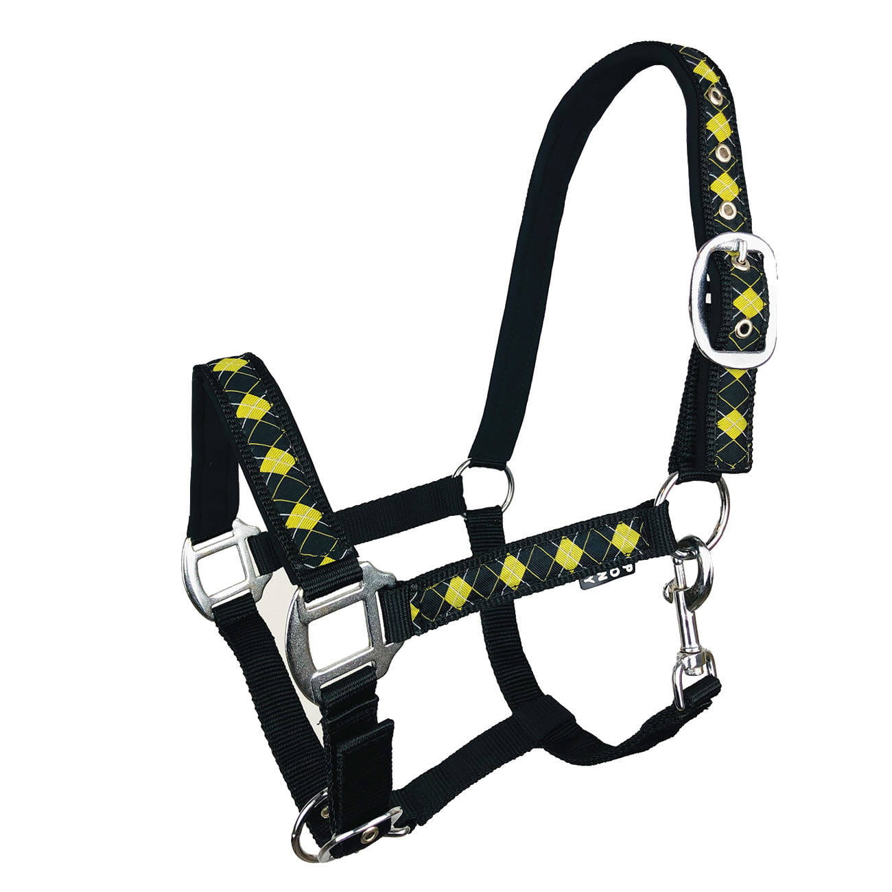 Dzięki licznym wariantom kolorystycznym i szerokiej rozmiarówce, każdy znajdzie odpowiedni model dla siebie. kantar ozdobiony wzorem w romby podszyty imitacją nubuku posiada regulację na pasku potylicznym i nachrapniku okucia w srebrnym kolorze