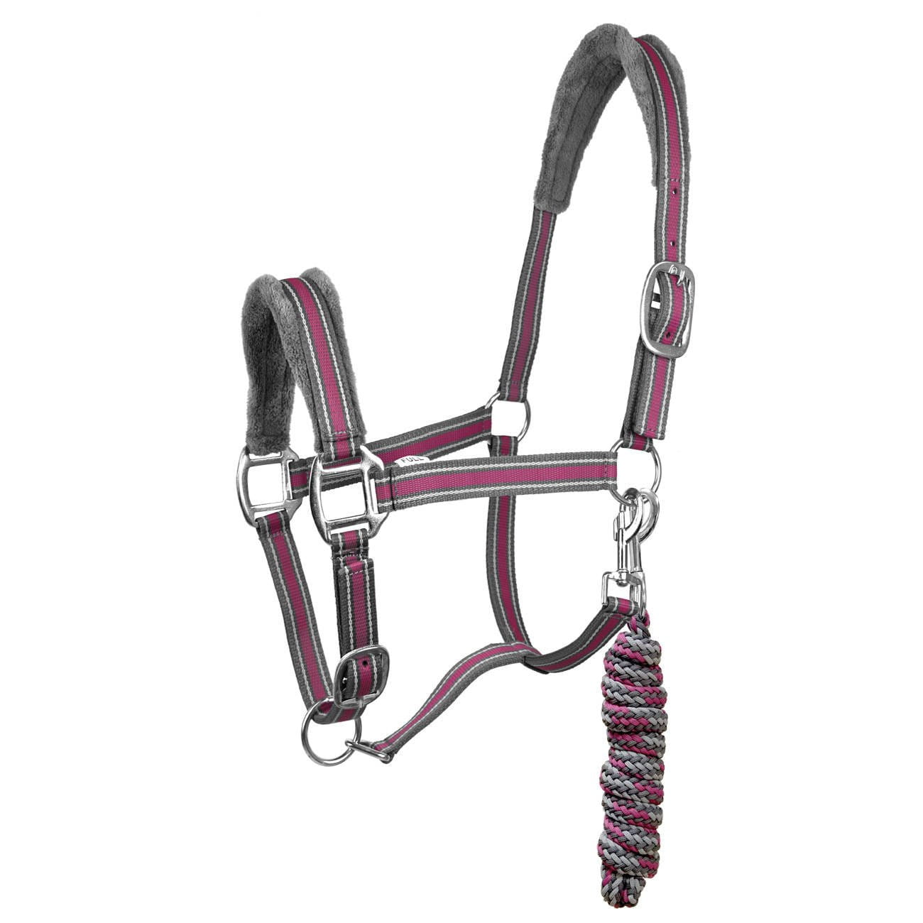 kantar w zestawie z uwiązem możliwość regulacji na nachrapniku i pasku potylicznym podszycie z miękkiego futerka w szarym kolorze uwiąz