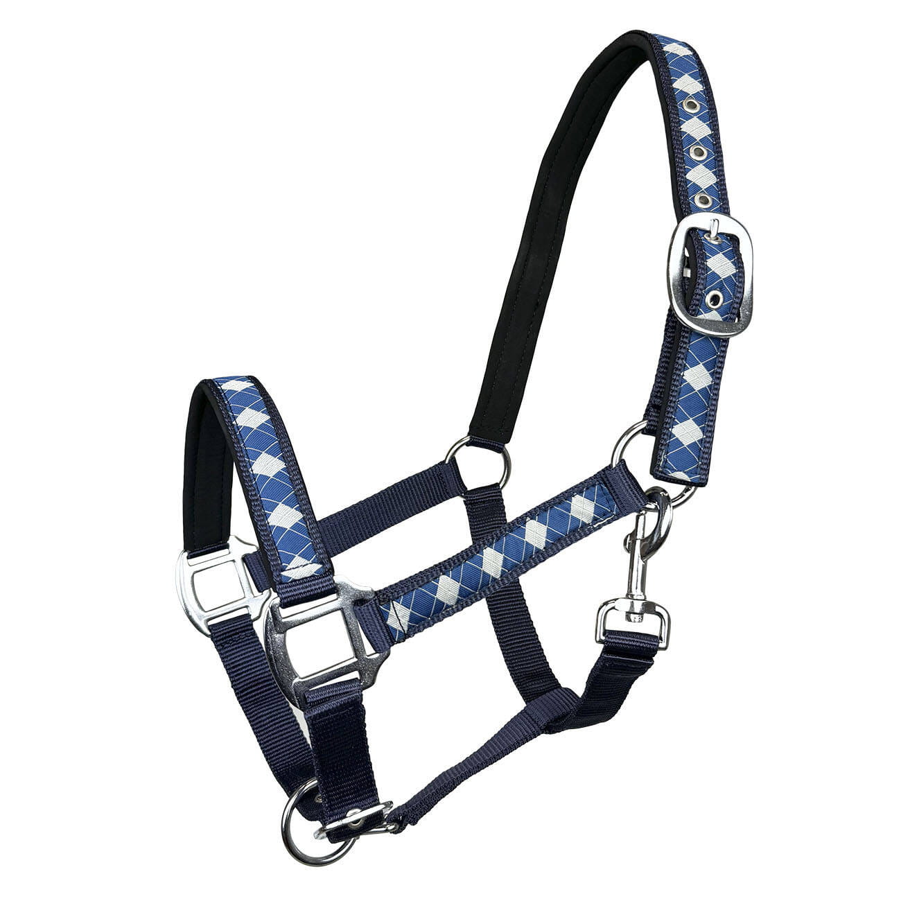 Dzięki licznym wariantom kolorystycznym i szerokiej rozmiarówce, każdy znajdzie odpowiedni model dla siebie. kantar ozdobiony wzorem w romby podszyty imitacją nubuku posiada regulację na pasku potylicznym i nachrapniku okucia w srebrnym kolorze