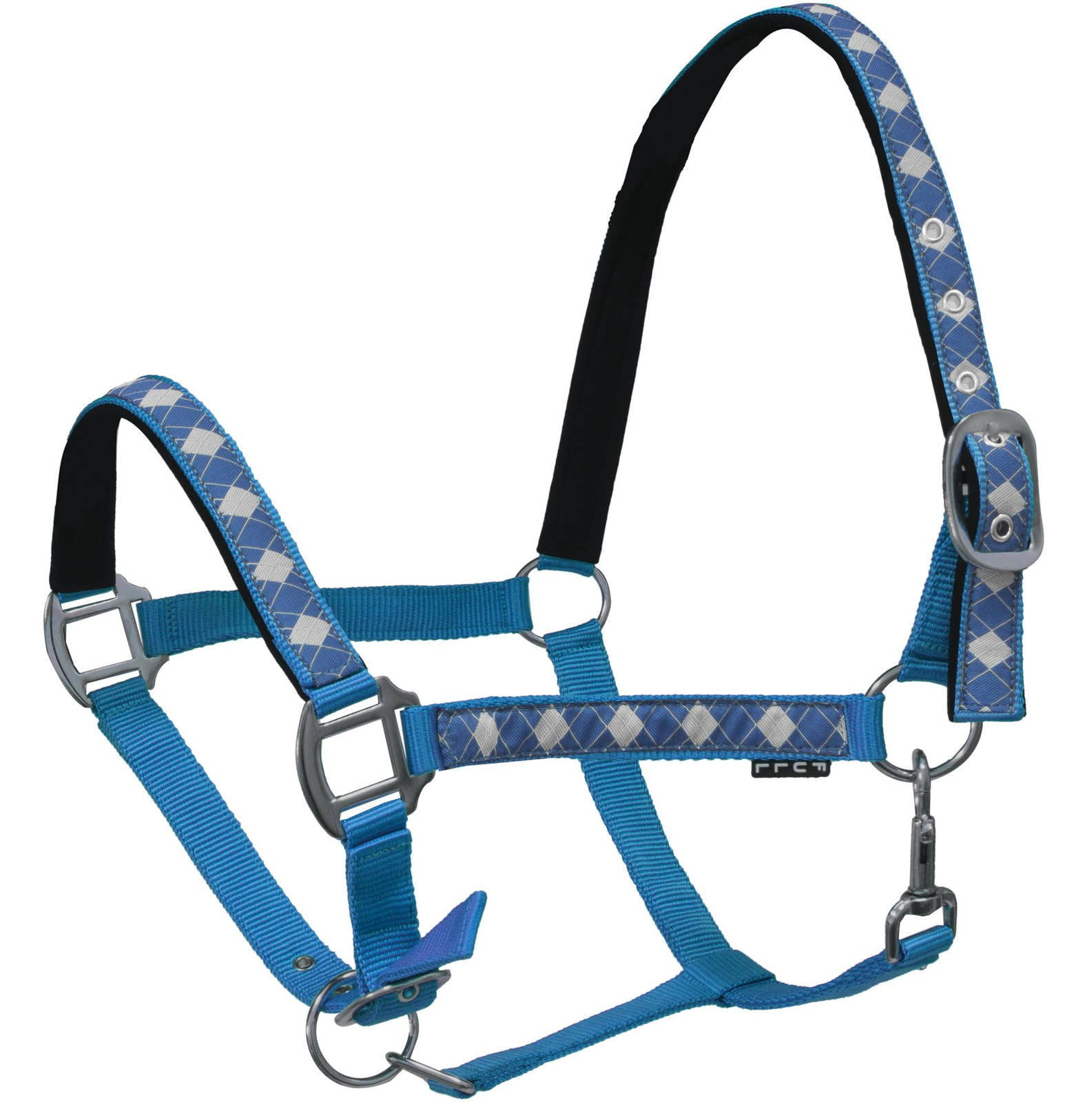 Dzięki licznym wariantom kolorystycznym i szerokiej rozmiarówce, każdy znajdzie odpowiedni model dla siebie. kantar ozdobiony wzorem w romby podszyty imitacją nubuku posiada regulację na pasku potylicznym i nachrapniku okucia w srebrnym kolorze