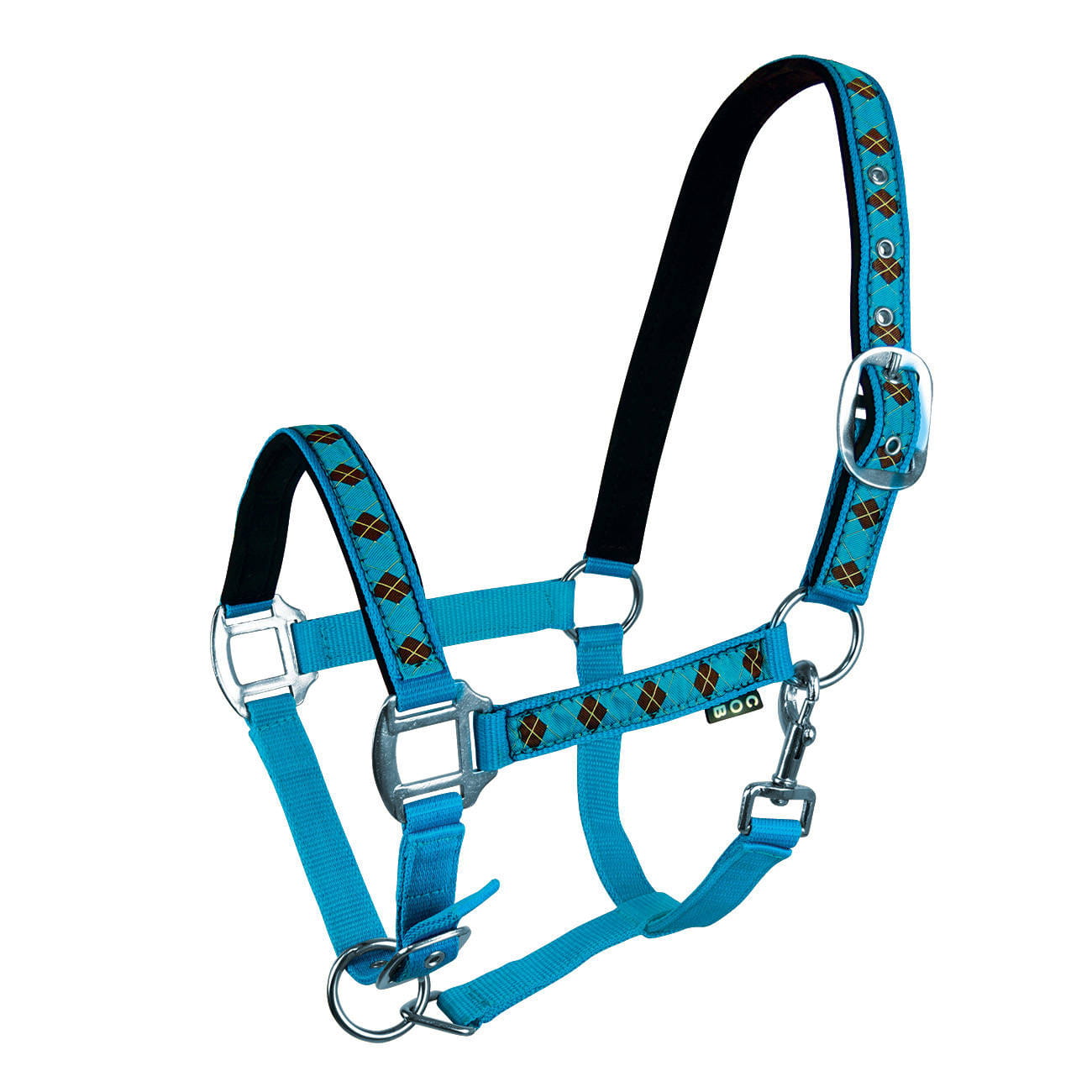 Dzięki licznym wariantom kolorystycznym i szerokiej rozmiarówce, każdy znajdzie odpowiedni model dla siebie. kantar ozdobiony wzorem w romby podszyty imitacją nubuku posiada regulację na pasku potylicznym i nachrapniku okucia w srebrnym kolorze