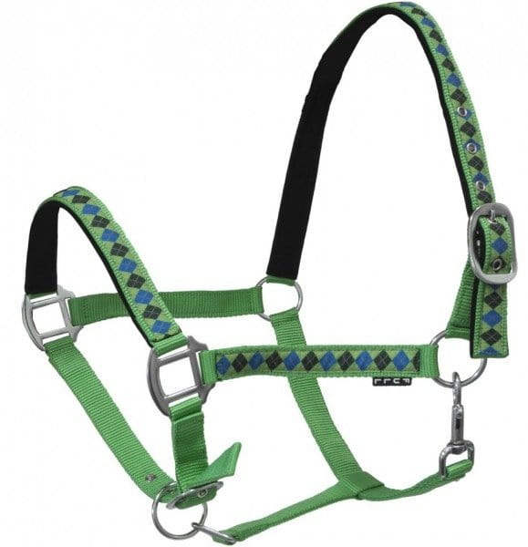 Dzięki licznym wariantom kolorystycznym i szerokiej rozmiarówce, każdy znajdzie odpowiedni model dla siebie. kantar ozdobiony wzorem w romby podszyty imitacją nubuku posiada regulację na pasku potylicznym i nachrapniku okucia w srebrnym kolorze